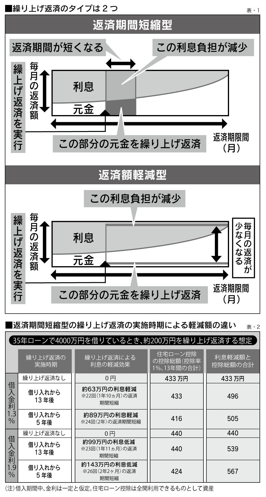 35年返済で4000万円借り入れている時①住宅ローン控除の期間が終了した13年経過後と②控除期間中である返済開始から5年経過後に、それぞれ約200万円の繰上げ返済をした場合を比較してみたのが表・2です。