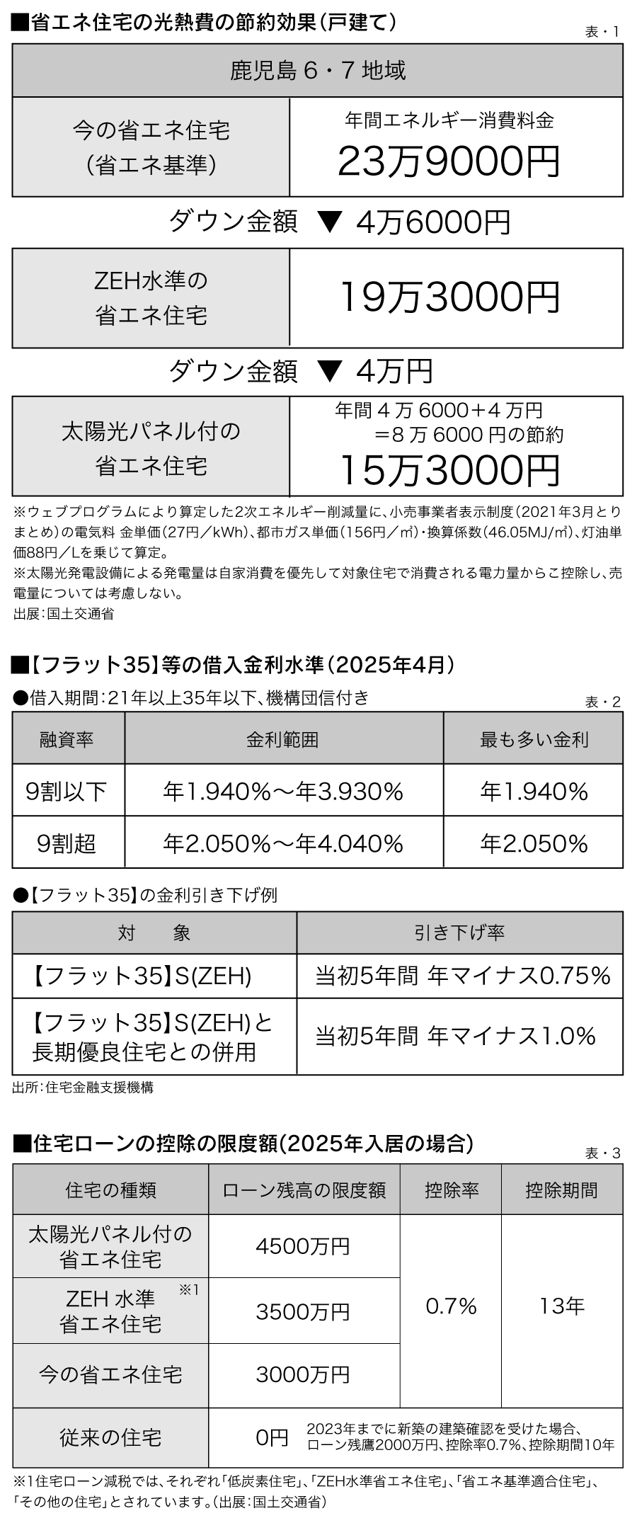 省エネ性能の高い住宅では確実にZEHが実現しています。表・1は、各住宅の省エネ効果です。6・7地域(鹿児島等)の戸建住宅の場合で、省エネ基準から「ZEH水準」に性能アップすると年間約4万6000円の節約効果、さらに太陽光パネルを搭載すると、年間約4万円の削減効果がうまれ、「省エネ基準」の住宅との差は年間8万6000円もの節約効果になります。