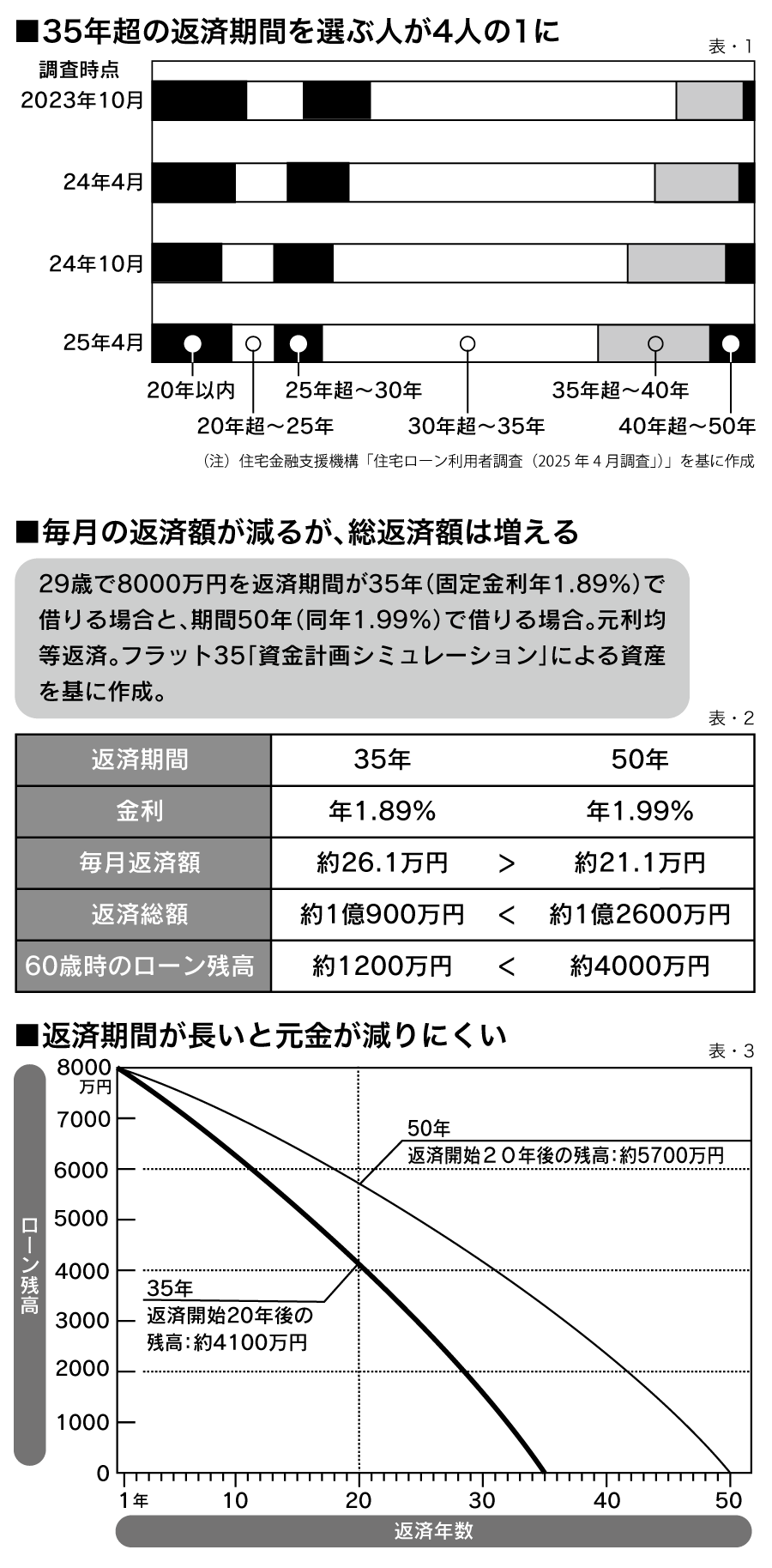 50年ローンは、主に20代から30台前半の契約者を対象に、完済時の年齢80歳くらいまでを上限にして返済期間を最長50年にするローンです。住信SBIネット銀行が23年8月に取扱いを開始し、au自分銀行やpaypay銀行も導入を始め、住信SBIネット銀行の場合は、25年度の4〜9月の契約のうち、約3割の返済期限が35年以上だったようです。